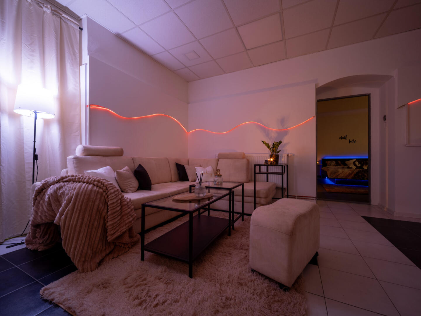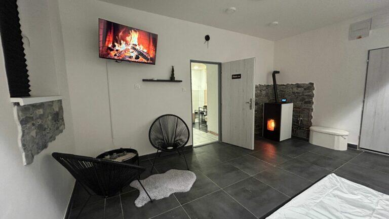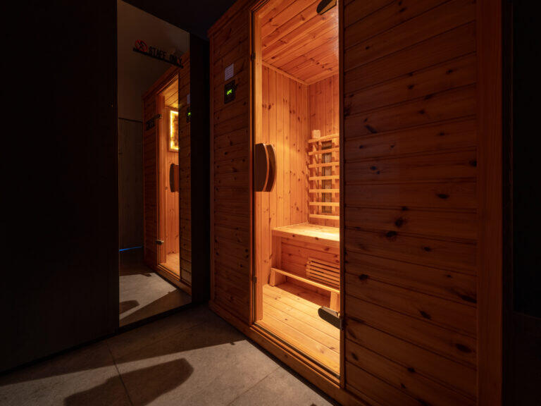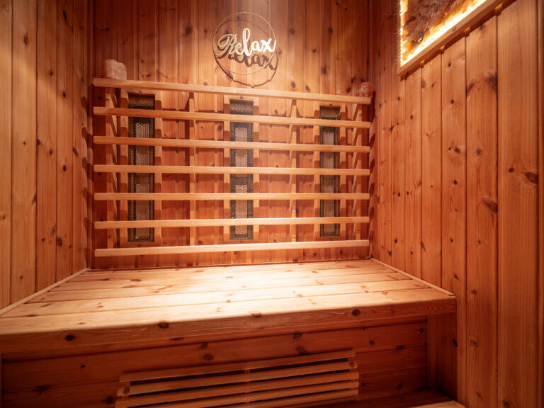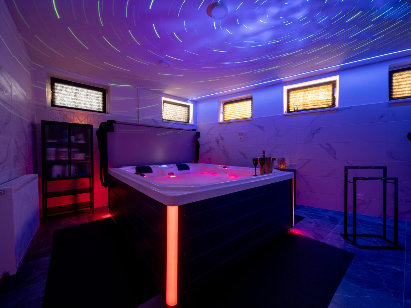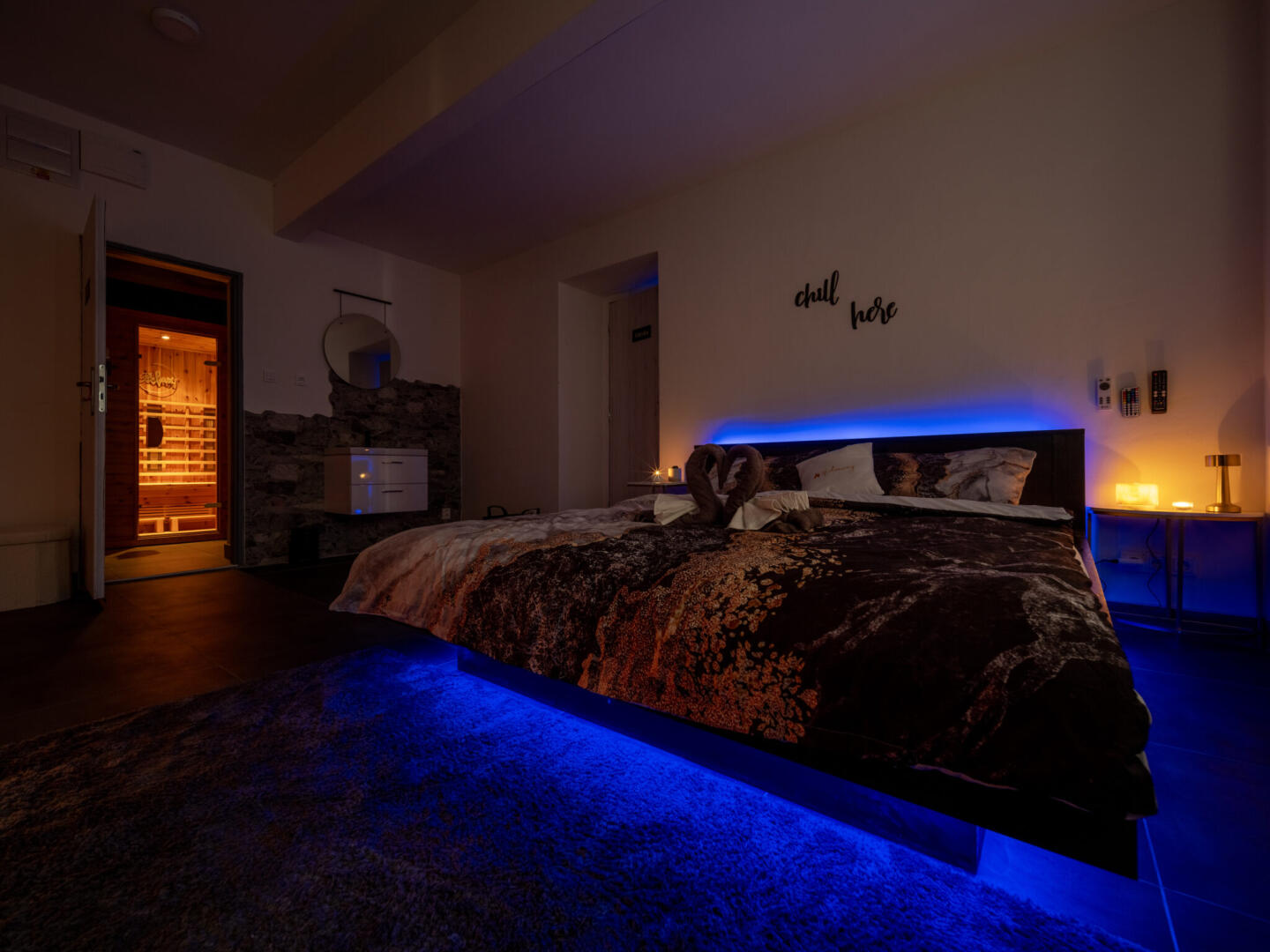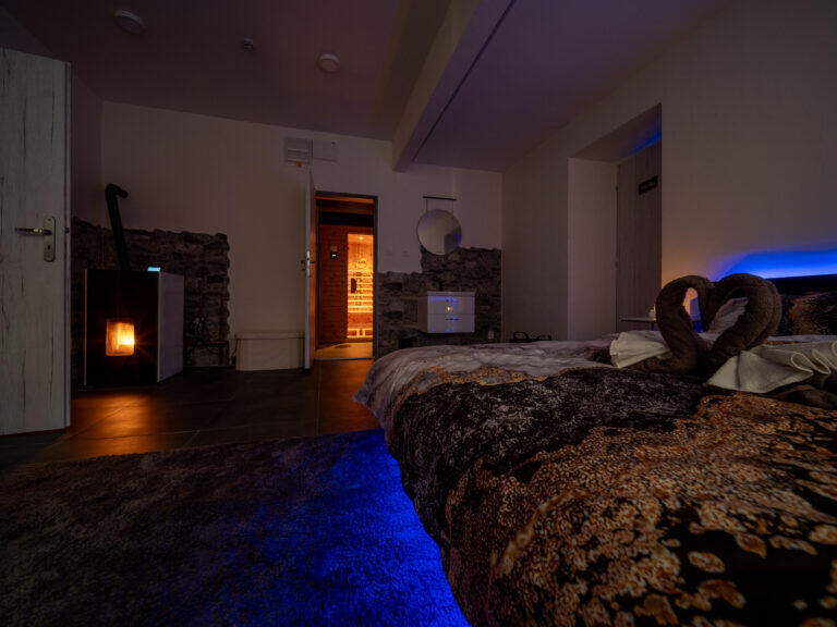 V první místnosti je pro Vás připraven bohatý minibar, posezení, prostor pro oslavy či setkání. (Tento prostor má z bezpečnostních důvodů monitorovám vstup.) Následuje již privátní zóna s krbem, postelí a pohodlnými křesílky u zenové zahrádky. Dále vstupujete do místnosti s Whirlpool či Jacuzzi – vířivkou. Pokračujeme do vyhřáté a provoněné sauny se solnými panely.